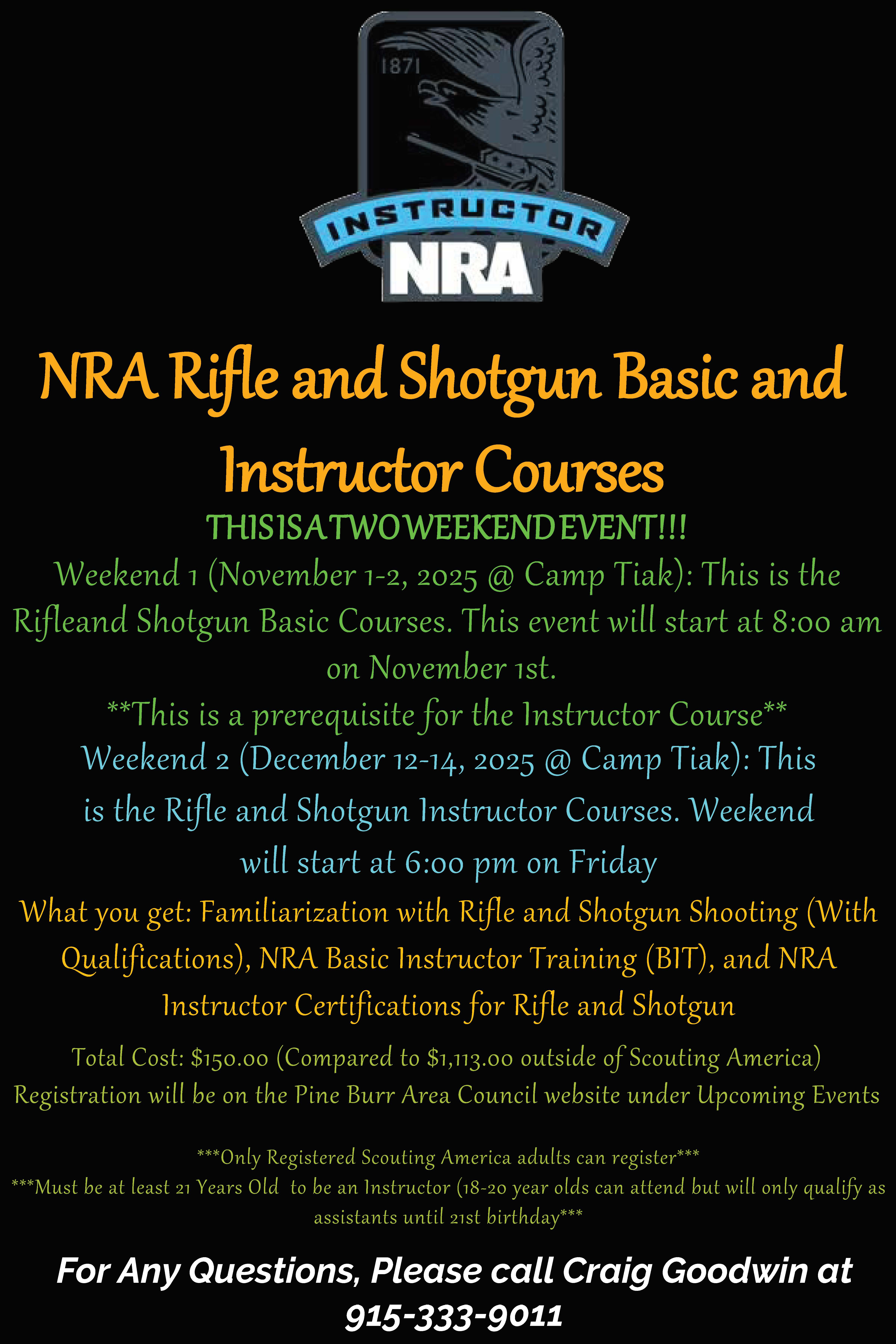 This is a two-weekend event designed for Scouting America adults who want to expand their shooting sports knowledge and earn NRA Instructor Certifications.