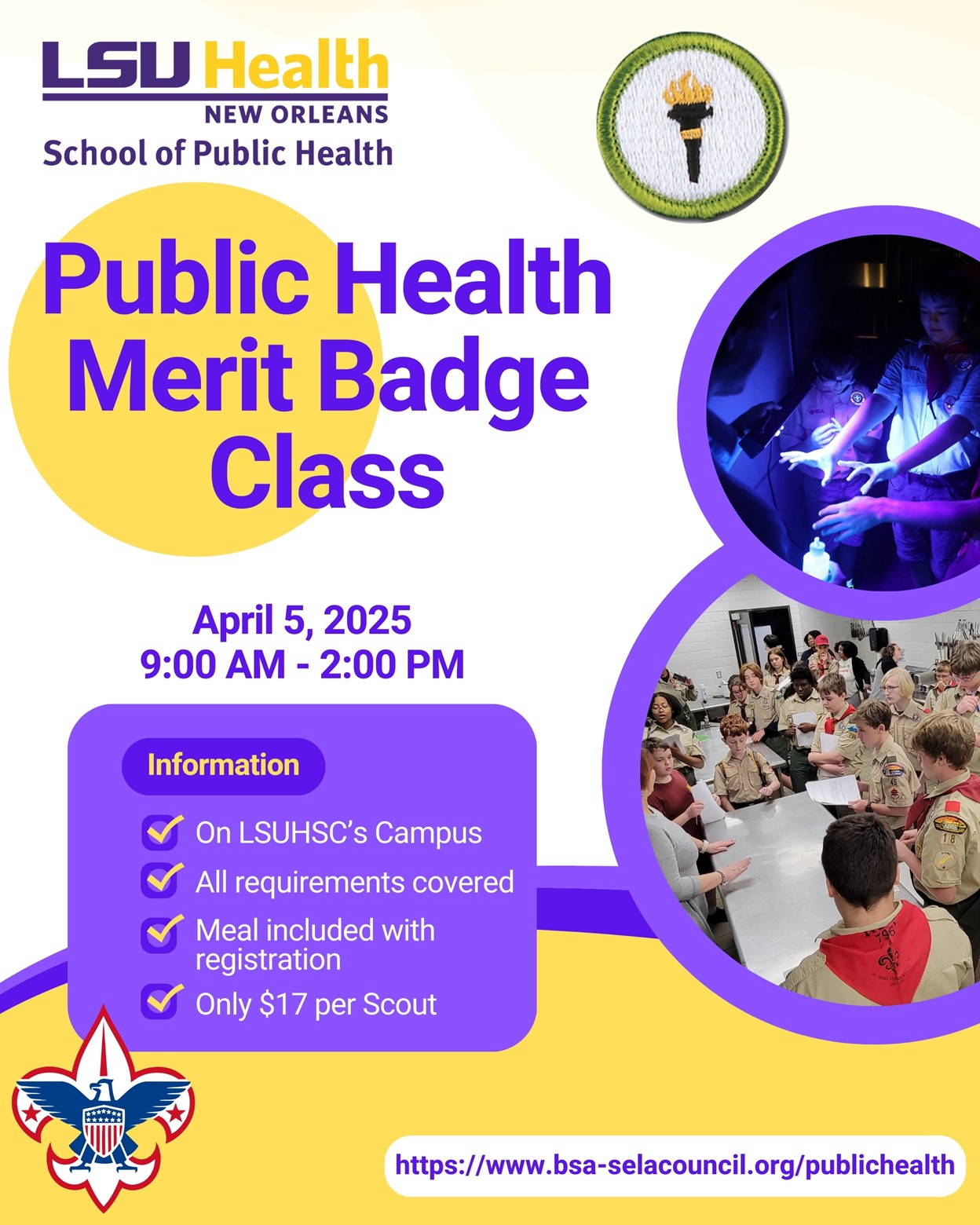 Please join us in the annual LSUHSC School of Public Health’s Public Health Merit Badge Class. The Student Government Association of the School of Public Health offers an Annual Boy Scouts of America Public Health Merit Badge Day. During the Merit Badge Day, current students enrolled in the School of Public Health will teach the Scouts BSA about Public Health; following the BSA requirements for the Public Health Merit Badge. This will be held at our School located on the downtown campus of LSU Health Sciences Center. Parking will be available, or you are welcome to drop your Scout off for the event. Adults wishing to stay on campus for the event can register to purchase a meal. We will cover ALL of the requirements in detail including requirement #5 where we will visit the University Cafeteria. The cafeteria tour starts after our lunch break.
